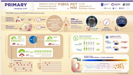 An influential prostate cancer study, co-authored by Peter Mac experts, has been named European Urology’s Best Scientific Paper of 2021. Published in late 2021, the paper related results of the PRIMARY imaging trial. PRIMARY investigated whether adding PSMA (prostate-specific membrane antigen) scanning to MRI prior to biopsy could be helpful in the early diagnosis of prostate cancer. The trial showed improved results, which have now led to the PRIMARY 2 study. Highly-regarded, European Urology has the highest impact factor of all surgical journals. PRIMARY was a collaboration between Peter Mac clinicians and researchers Dr James Buteau, Associate Professor Daniel Moon, Dr Omar Alghazo, Professor Nathan Lawrentschuk, Professor Declan Murphy and Professor Michael Hofman, led by Professor Louise Emmett at the Garvan Institute, her colleague Professor Philip Stricker, and other Australian researchers. 291 men took part in the trial, with Peter Mac recruiting the most participants of all contributing centres. Peter Mac’s Associate Professor Daniel Moon recruited almost 100 patients. The PRIMARY 2 Peter Mac sponsored phase 3 trial is currently recruiting, with a goal of 660 participants. The multicentre, randomised trial is co-ordinated by Peter Mac’s ProsTIC (the Prostate Cancer Theranostics Imaging Centre of Excellence) with funding from the Prostate Cancer Foundation, the Peter MacCallum Foundation and further philanthropic support through Louise Emmett, St Vincent’s NSW. ProsTIC will host a two-day education event for clinical professionals in Melbourne on Friday 1 April and Saturday 2 April 2022.