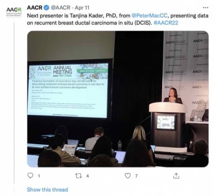 Patients with recurrent tumours genetically distinct from the primary tumour may require different treatment. More than 10 per cent of cases of recurrent ductal carcinoma in situ (DCIS) of the breast were new tumours occurring independently of the primary lesion and had distinct genetic alterations, according to Peter Mac research presented at the AACR Annual Meeting 2022 earlier this week. "DCIS is a precancerous lesion that recurs in approximately 25 per cent of patients, and half of these recurrences are invasive cancer with potential life-threatening consequences," says postdoctoral researcher Dr Tanjina Kader who presented the work. According to Dr Kader, it had been assumed that all recurrent tumours occurring in the same breast were directly related to the original tumour but never proven. "Knowing how common new primary tumours are will help us determine whether or not a tumour biomarker can be used to predict the chance of a tumour in the same breast, because such a biomarker might not be effective in predicting new, unrelated tumours," she says. In this study, Dr Kader and colleagues assembled 67 pairs of matched primary DCIS and recurrence cases to explore their genetic changes, with the goal of understanding how often a recurrence is a new tumour. The study also included a set of 32 nonrecurrent DCIS cases. The researchers performed DNA sequencing on each pair to obtain information on mutations and changes in gene copy number. They then used multiple statistical approaches to analyse the sequencing data and perform phylogenetic analyses of the tumour samples. This type of analysis allowed them to establish whether the primary DCIS and the recurrent tumours shared cancer-driving genetic events and were therefore derived from a common ancestor cell. "This is similar to building a family tree of the tumours based on the genetic events," Dr Kader says. "We can estimate how distantly related the primary DCIS and recurrence pairs are to each other and to a potential original ancestor cell, and we can track how the tumour pairs have evolved over time." The results revealed that while the majority of recurrent cases were clonal (derived from a common ancestor cell and sharing the same genetic events of the original tumour), 18 per cent of recurrent tumours were new primary lesions, unrelated to the original DCIS. "These findings can influence how patients are managed in the clinic," Dr Kader says. "For example, the occurrence of a new primary lesion in the same patient suggests a high-risk breast environment in which new tumours may develop over the years. Therefore, such patients would be candidates for preventative breast removal surgery even if the tumour is small, and they might be referred to genetic testing to ascertain whether they have any genetic predisposition." The researchers also found that four chromosomal changes and mutation in the TP53 gene were detected frequently in the recurrences related to the primary lesion, but these gene variations were not common in primary DCIS cases that don't recur and those that had non-clonal (independent) recurrence. "This particular finding from the 18 per cent of patients in our cohort who developed new, independent primary tumours raised the question of whether using these genetic biomarkers for prediction of recurrence is a good idea," Dr Kader says. "The fact that these patients did not have one of the genetic events that are more common in recurring DCIS would suggest that their risk was low, leading to undertreatment." Overall, Dr Kader says, the findings from this study suggest that when patients have an apparent recurrence from DCIS, the treatment decision should involve determining whether the recurrent lesion is related to the original tumour, as women who develop a second independent DCIS or cancer are more likely to have a higher risk of developing tumours again. "Further research is needed to understand the biology of DCIS recurrence, the progression from DCIS to invasive disease, and the role played by the tumour microenvironment and the immune system," Dr Kader says. The study was supported by the National Breast Cancer Foundation, the Cancer Council Victoria, and the Victorian Cancer Agency. Contacts: For more information contact the Peter Mac Communications team on 0417 123 048. About Peter Mac Peter MacCallum Cancer Centre is a world-leading cancer research, education and treatment centre and Australia's only public health service solely dedicated to caring for people affected by cancer.