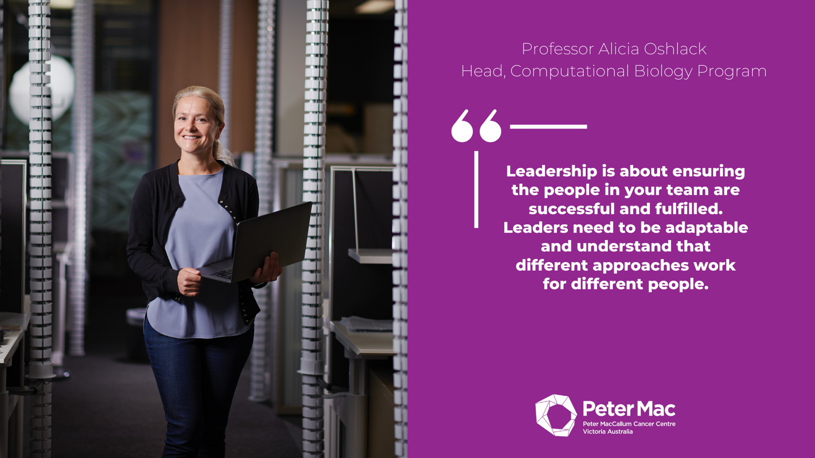 Professor Alicia Oshlack, Head, Computational Biology ProgramLeadership is about ensuring the people in your team are successful and fulfilled. Leaders need to be adaptable and understand that different approaches work for different people.