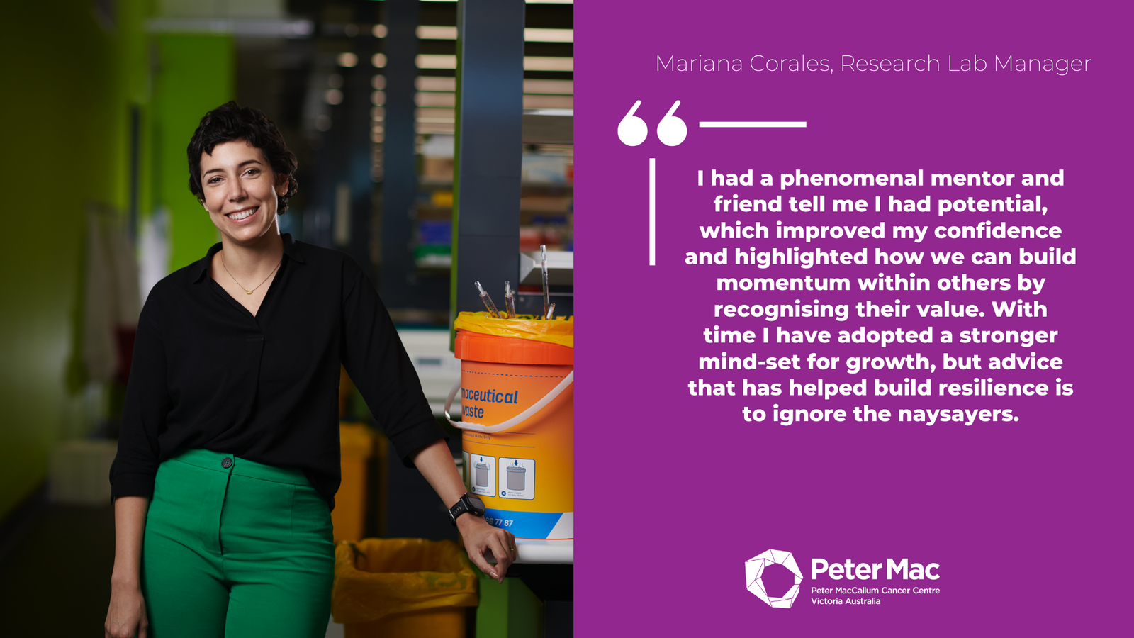 Mariana Corales, Research Lab ManagerI had a phenomenal mentor and friend tell me I had potential, which improved my confidence and highlighted how we can build momentum within others by recognising their value. With time I have adopted a stronger mind-set for growth, but advice that has helped build resilience is to ignore the naysayers.