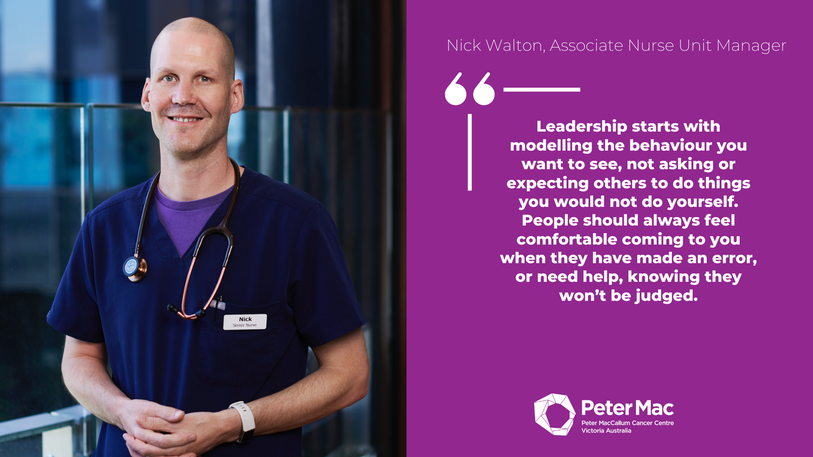Nick Walton, Associate Nurse Unit ManagerLeadership starts with modelling the behaviour you want to see, not asking or expecting others to do things you would not do yourself. People should always feel comfortable coming to you when they have made an error, or need help, knowing they won’t be judged.