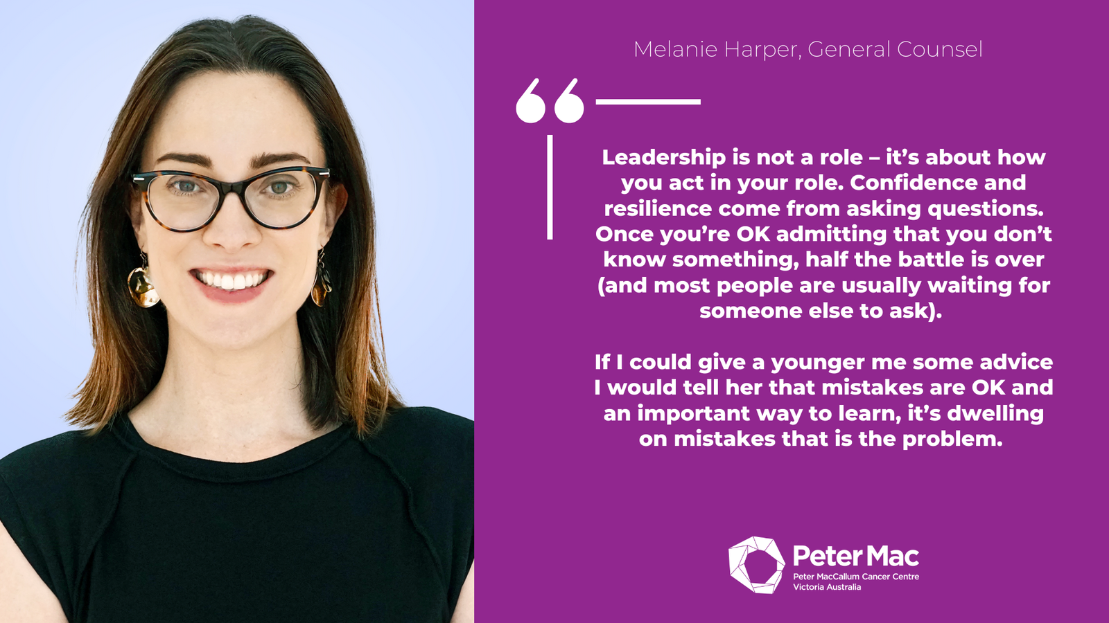 Melanie Harper, General CounselLeadership is not a role – it’s about how you act in your role. Confidence and resilience come from asking questions. Once you’re OK admitting that you don’t know something, half the battle is over (and most people are usually waiting for someone else to ask). If I could give a younger me some advice I would tell her that mistakes are OK and an important way to learn, it’s dwelling on mistakes that is the problem.