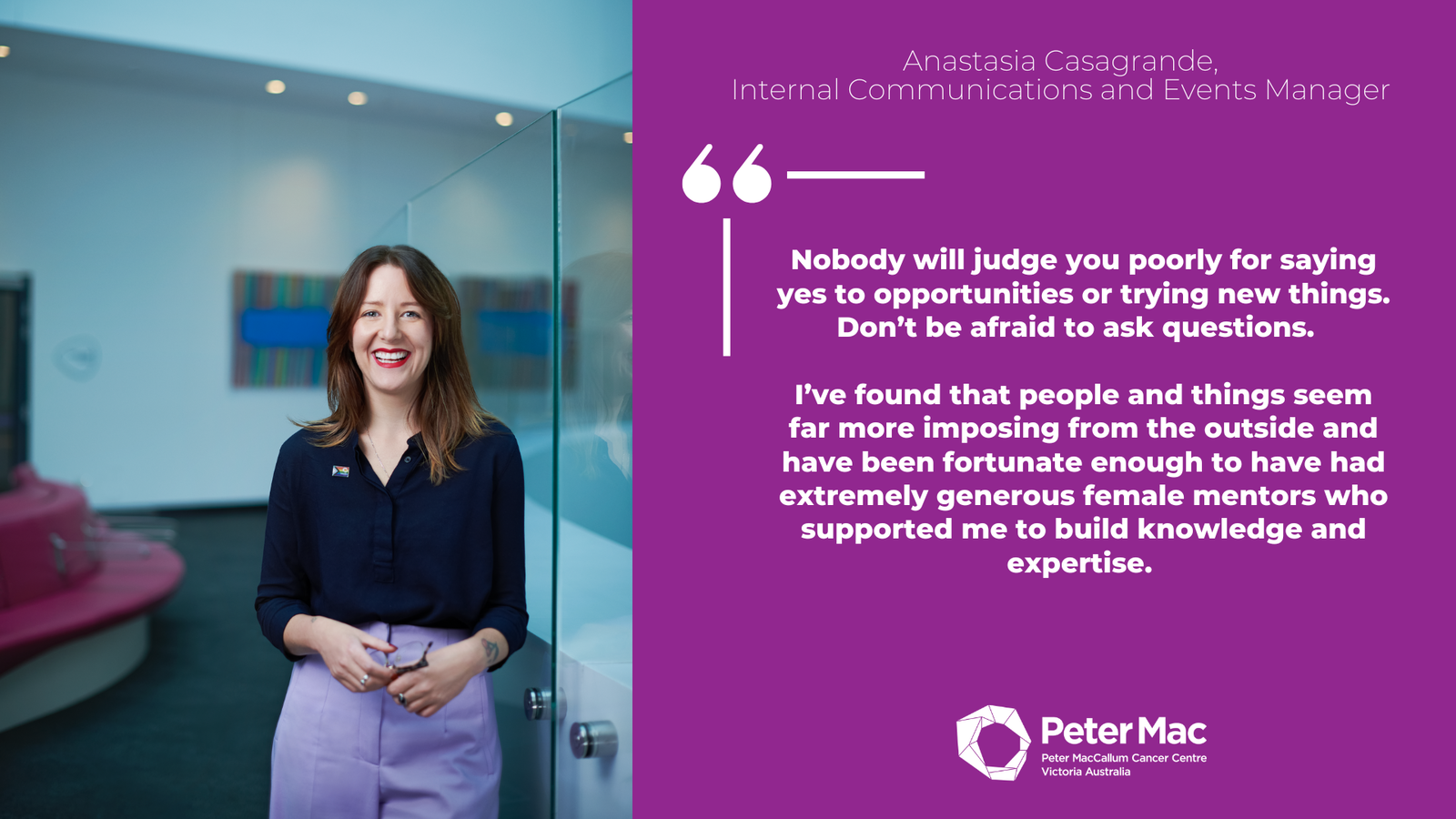 Anastasia Casagrande, Internal Communications and Events ManagerNobody will judge you poorly for saying yes to opportunities or trying new things. Don’t be afraid to ask questions. I’ve found that people and things seem far more imposing from the outside and have been fortunate enough to have had extremely generous female mentors who supported me to build knowledge and expertise.