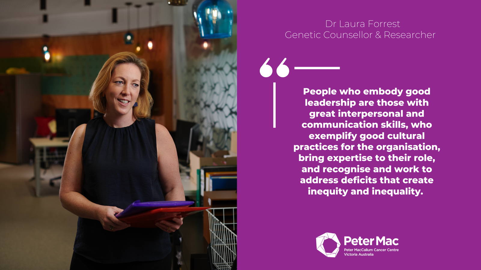 Dr Laura Forrest, Genetic Counsellor & ResearcherPeople who embody good leadership are those with great interpersonal and communication skills, who exemplify good cultural practices for the organisation, bring expertise to their role, and recognise and work to address deficits that create inequity and inequality.