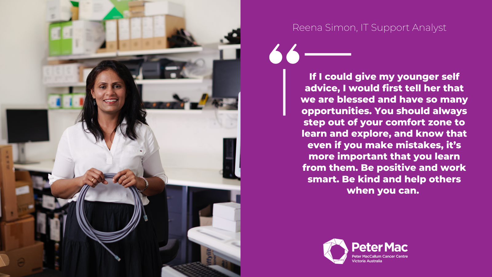 Reena Simon, IT Support AnalystIf I could give my younger self advice, I would first tell her that we are blessed and have so many opportunities. You should always step out of your comfort zone to learn and explore, and know that even if you make mistakes, it’s more important that you learn from them. Be positive and work smart. Be kind and help others when you can.