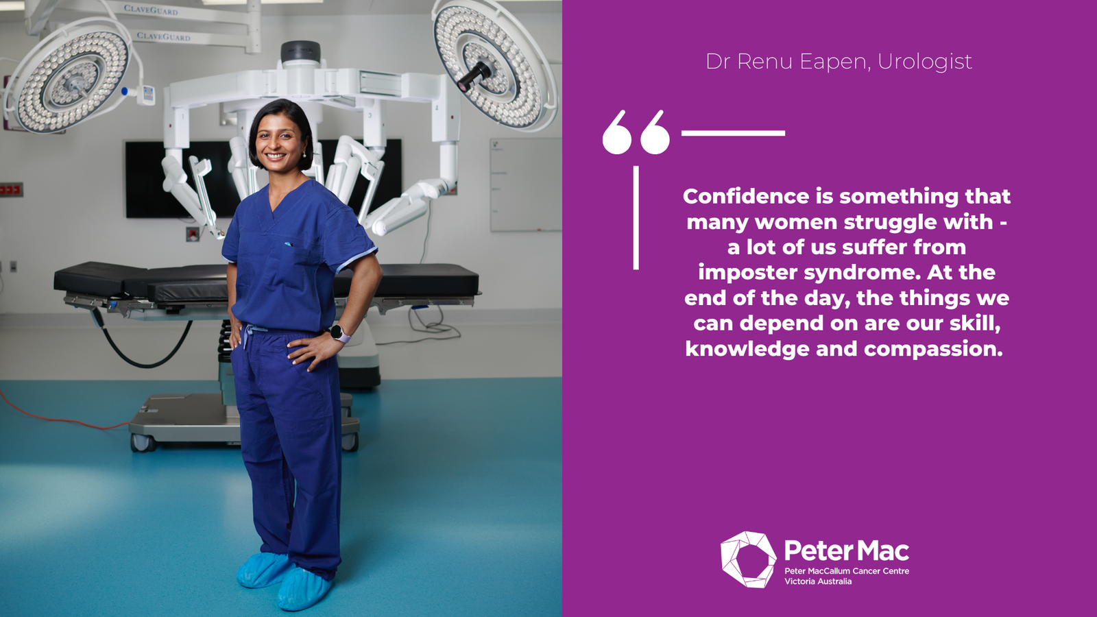 Dr Renu Eapen, UrologistConfidence is something that many women struggle with – a lot of us suffer from imposter syndrome. At the end of the day, the things we can depend on are our skill, knowledge, and compassion.