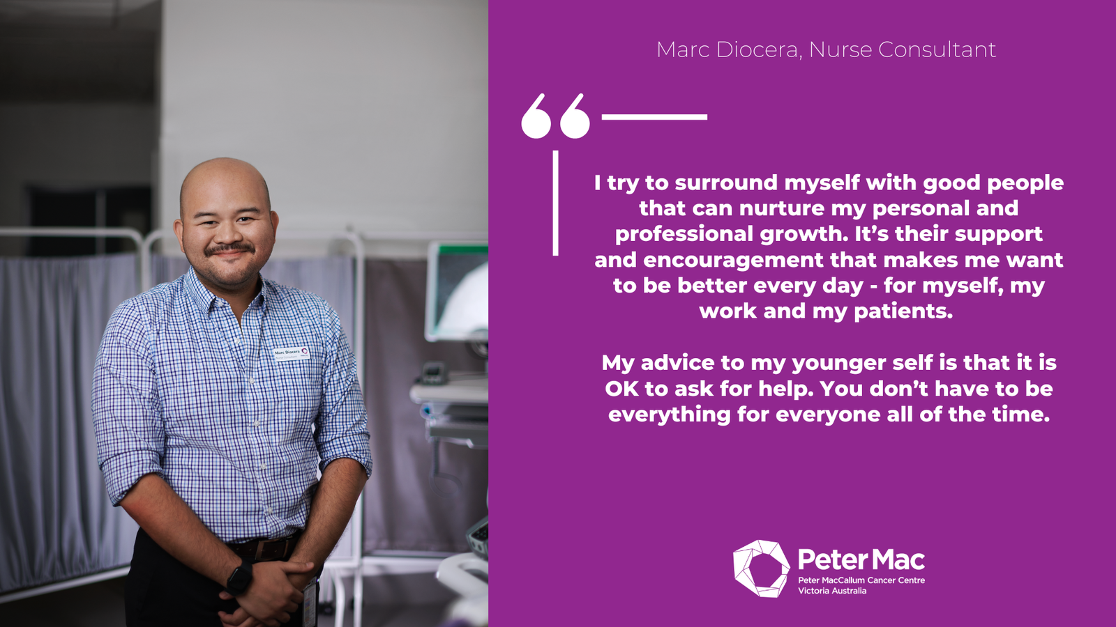 Marc Diocera, Nurse ConsultantI try to surround myself with good people that can nurture my personal and professional growth. It’s their support and encouragement that makes me want to be better every day – for myself, my work and my patients. My advice to my younger self is that it is OK to ask for help. You don’t have to be everything for everyone all of the time.
