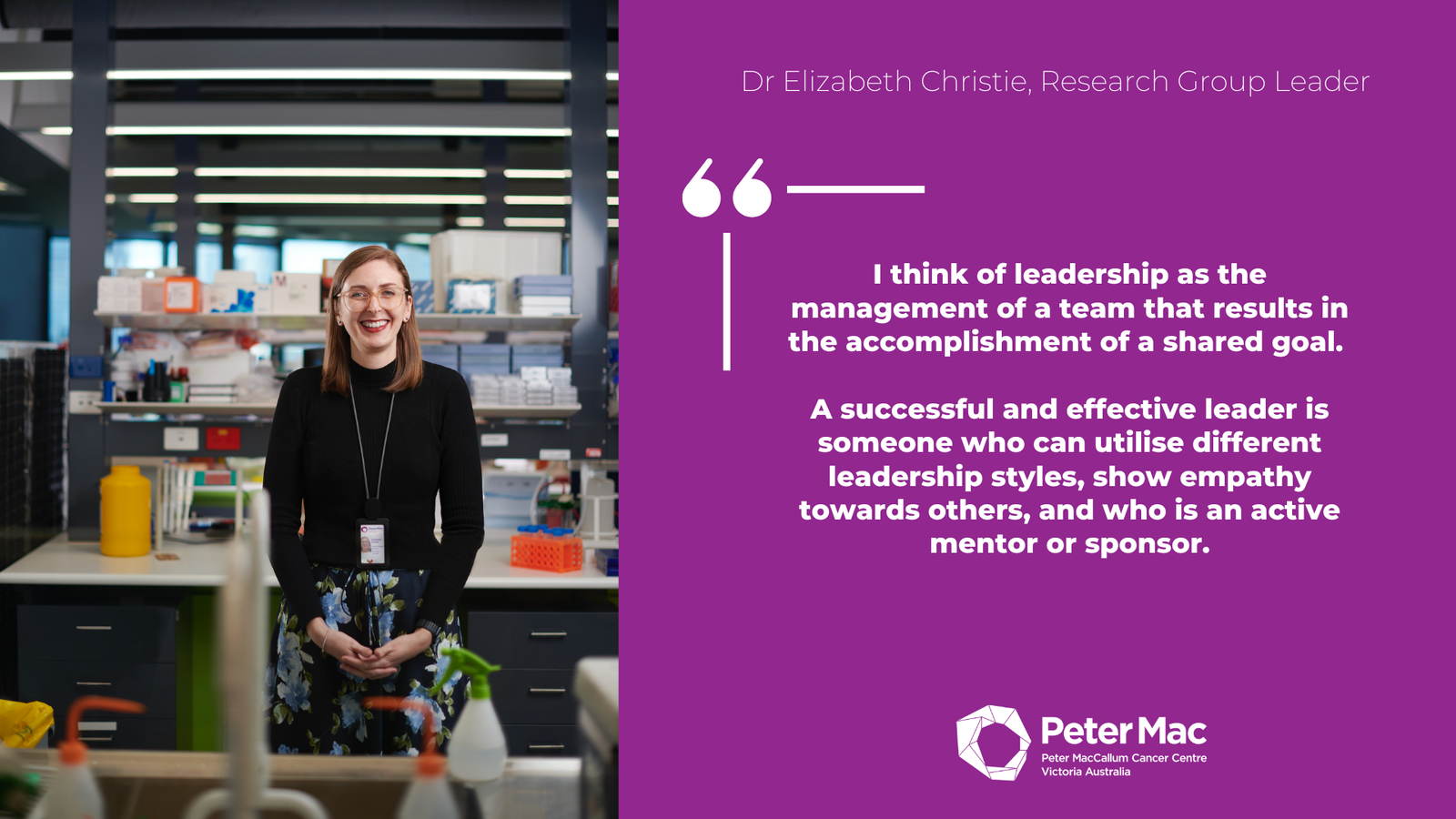 Dr Elizabeth Christie, Research Group leaderI think of leadership as the management of a team that results in the accomplishment of a shared goal. A successful and effective leader is someone who can utilise different leadership styles, show empathy towards others, and who is an active mentor or sponsor.