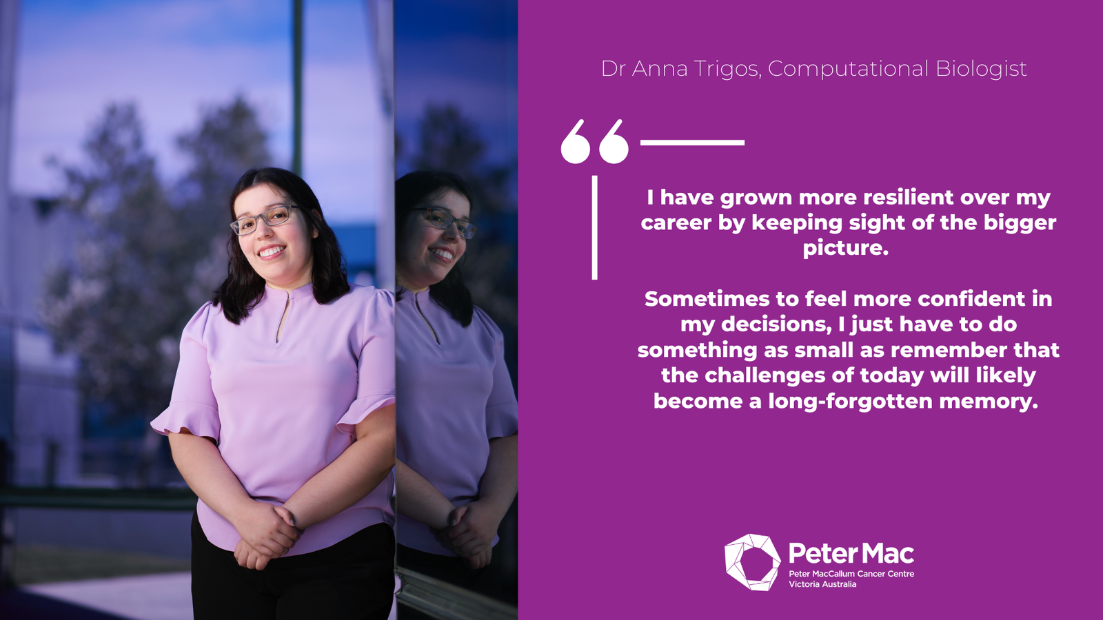 Dr Anna Trigos, Computational BiologistI have grown more resilient over my career by keeping sight of the bigger picture. Sometimes to feel more confident in my decisions, I just have to do something as small as remember that the challenges of today will likely become a long-forgotten memory.