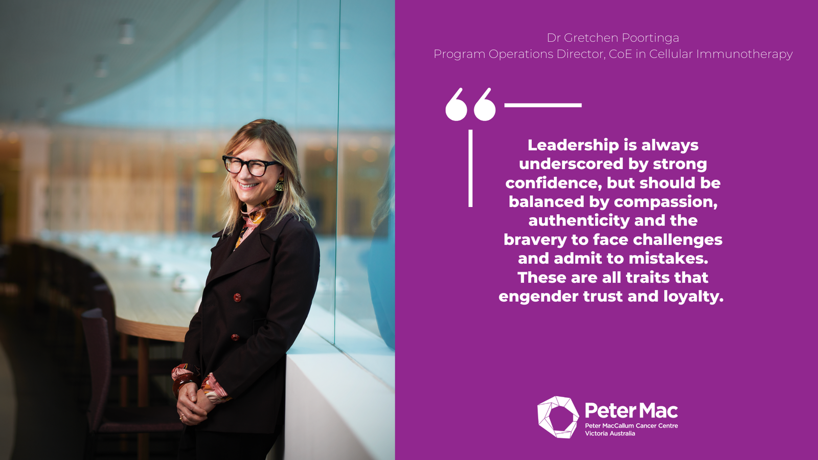 Dr Gretchen Poortinga, Program Operations Director, CoE in Cellular ImmunotherapyLeadership is always underscored by strong confidence, but should be balanced by compassion, authenticity and the bravery to face challenges and admit to mistakes. These are all traits that engender trust and loyalty.